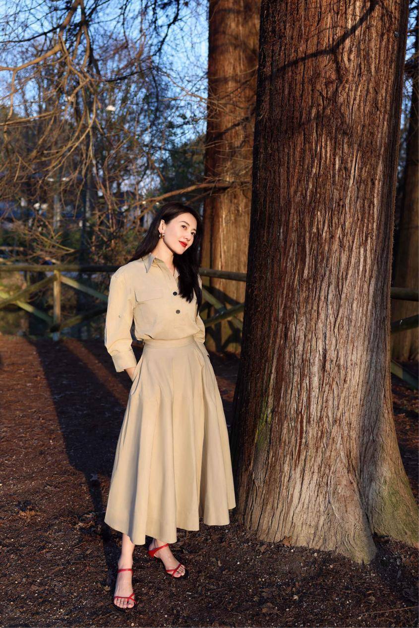 汤唯换上一条低饱和度的绿色连衣裙,瞬间变身“气质女神”。面料带有一定厚度,更具支撑性,裙腰贴合度高,裙摆宽大,显瘦又显腿长。