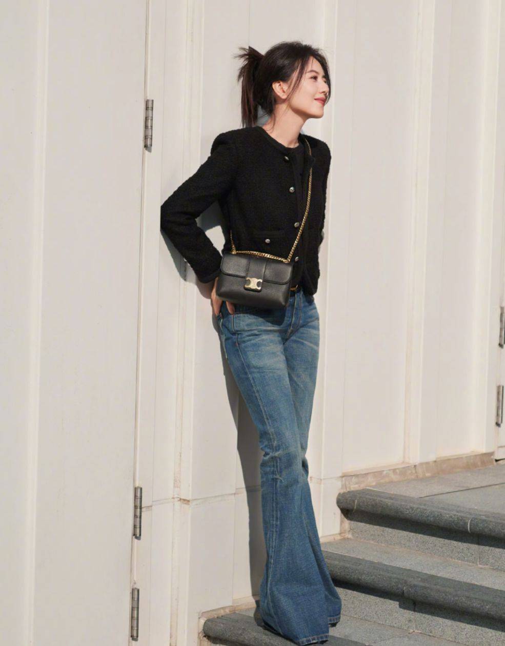 小香风的黑色短外套,飒爽利落且提升气场。搭配牛仔马蹄裤,优化腿型曲线,轻松展现好身材。