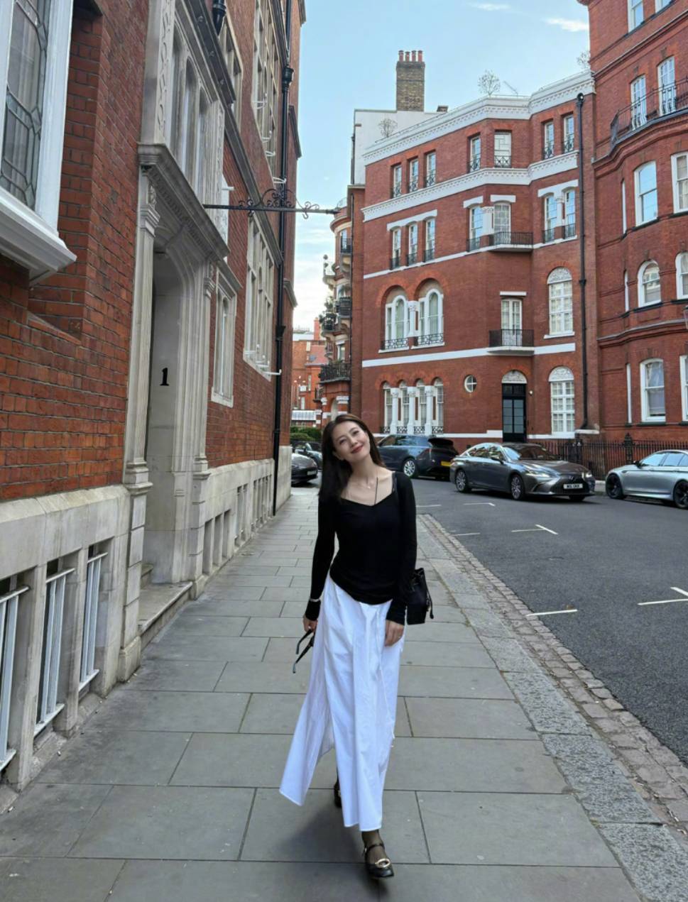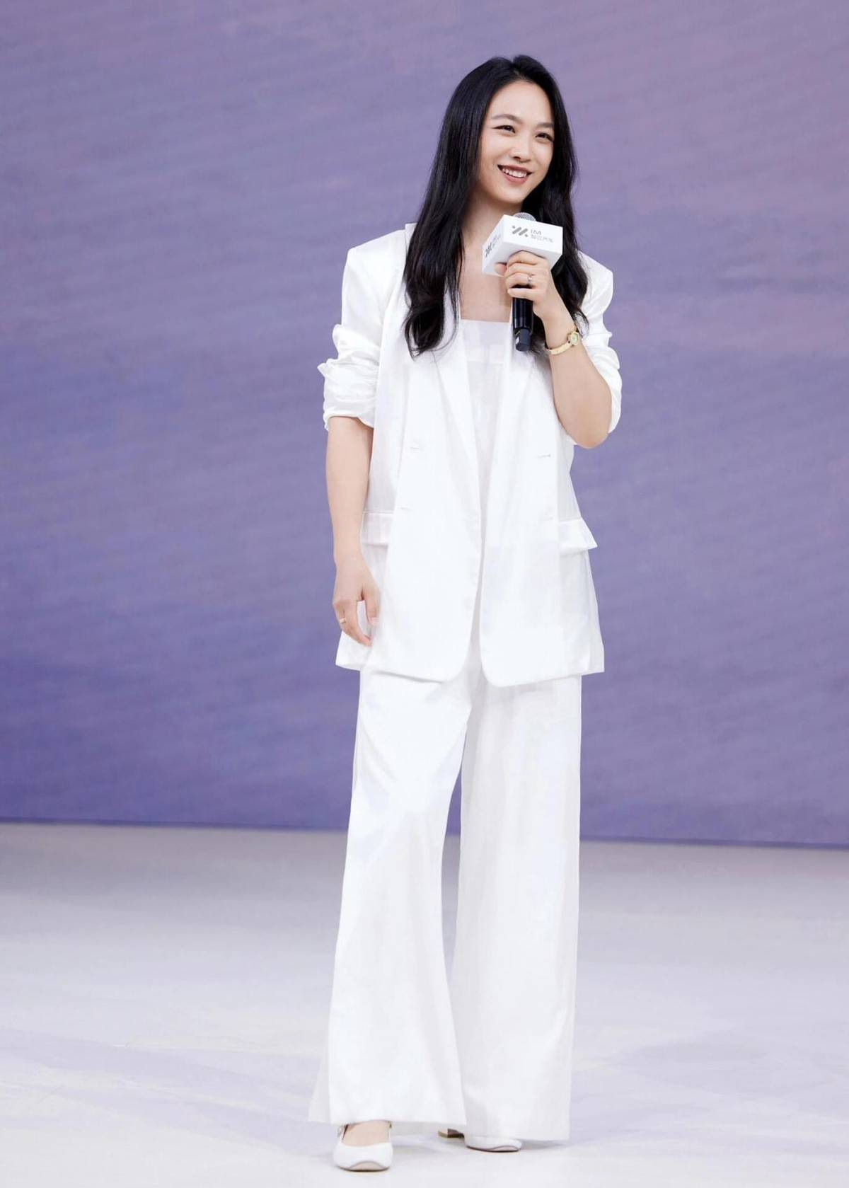 同样是白衬衫,当汤唯下身搭配一条黑色半身裙后,整个人的风格偏向高智感,还增添了几分优雅气息。