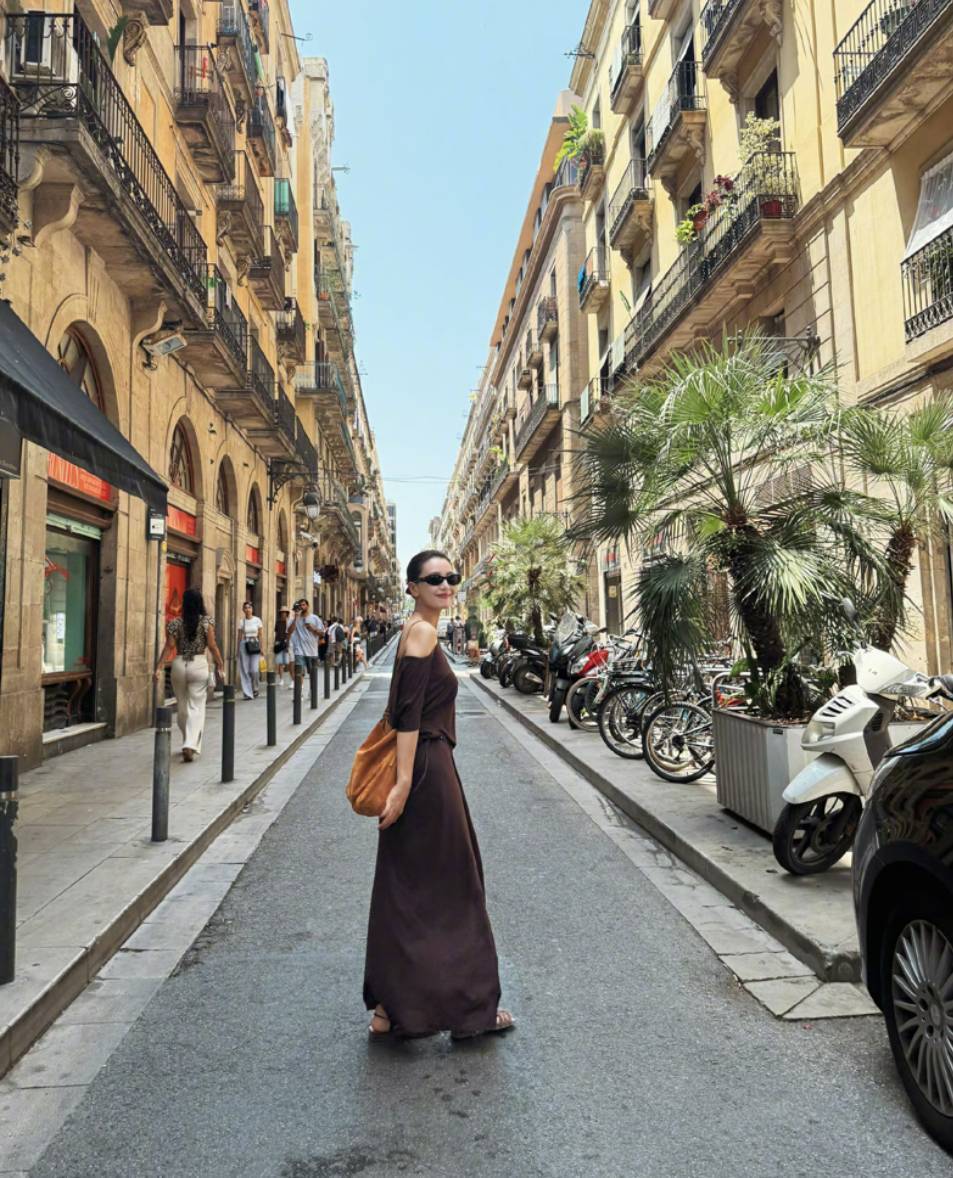 缺乏穿搭灵感时,不妨尝试套装。斜领上衣搭配及踝长裙,一身棕色却穿出清新脱俗的效果。