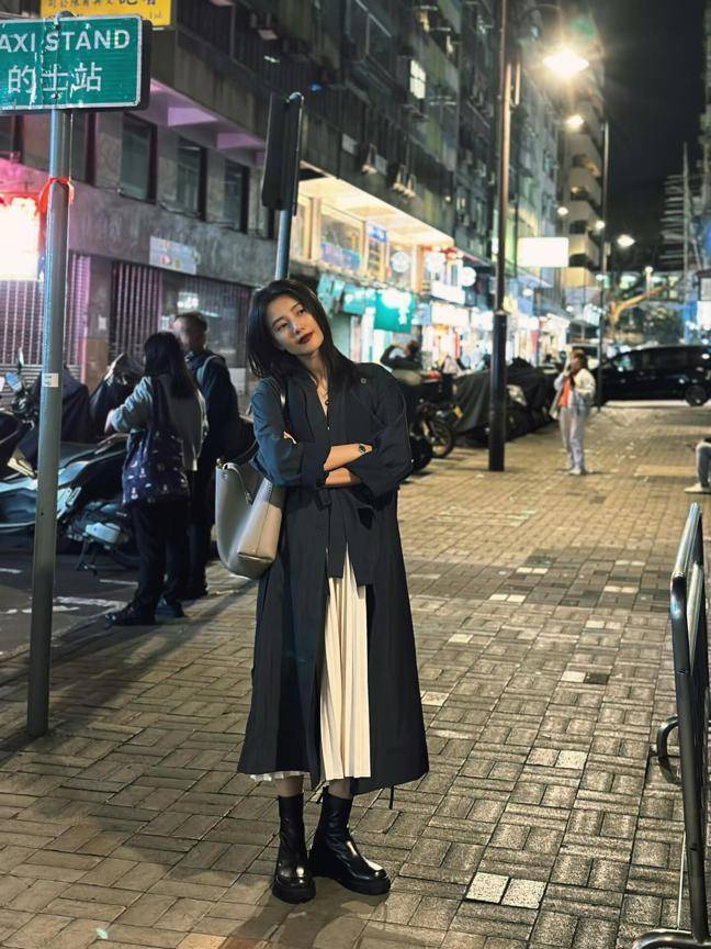长风衣与长裙的组合,属于气质型搭配。敞开风衣,露出飘逸裙摆,搭配短靴,又美又飒。
