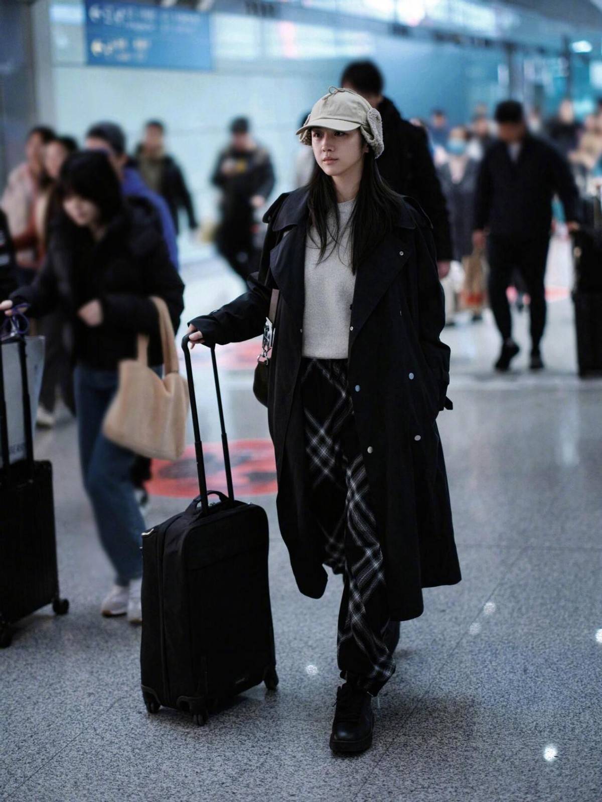 汤唯的机场穿搭同样极具借鉴价值。黑色长风衣搭配格棱阔腿裤,轻松穿出好气质,尤其是头上的“军帽”,更添时髦感。