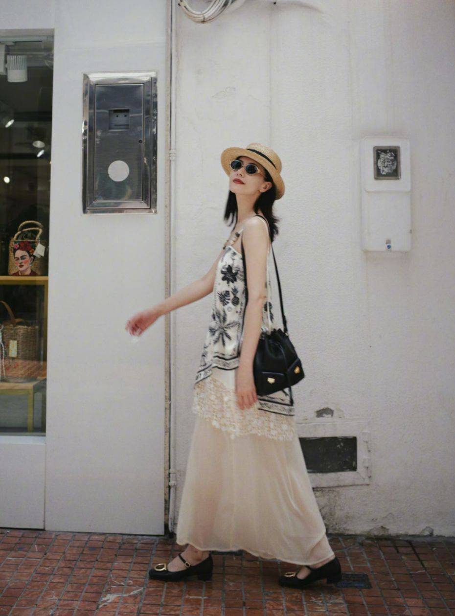 高圆圆的穿搭直接照搬也不会出错,简约而不失精致。蕾丝边设计的印花吊带叠穿纱裙,氛围感十足。